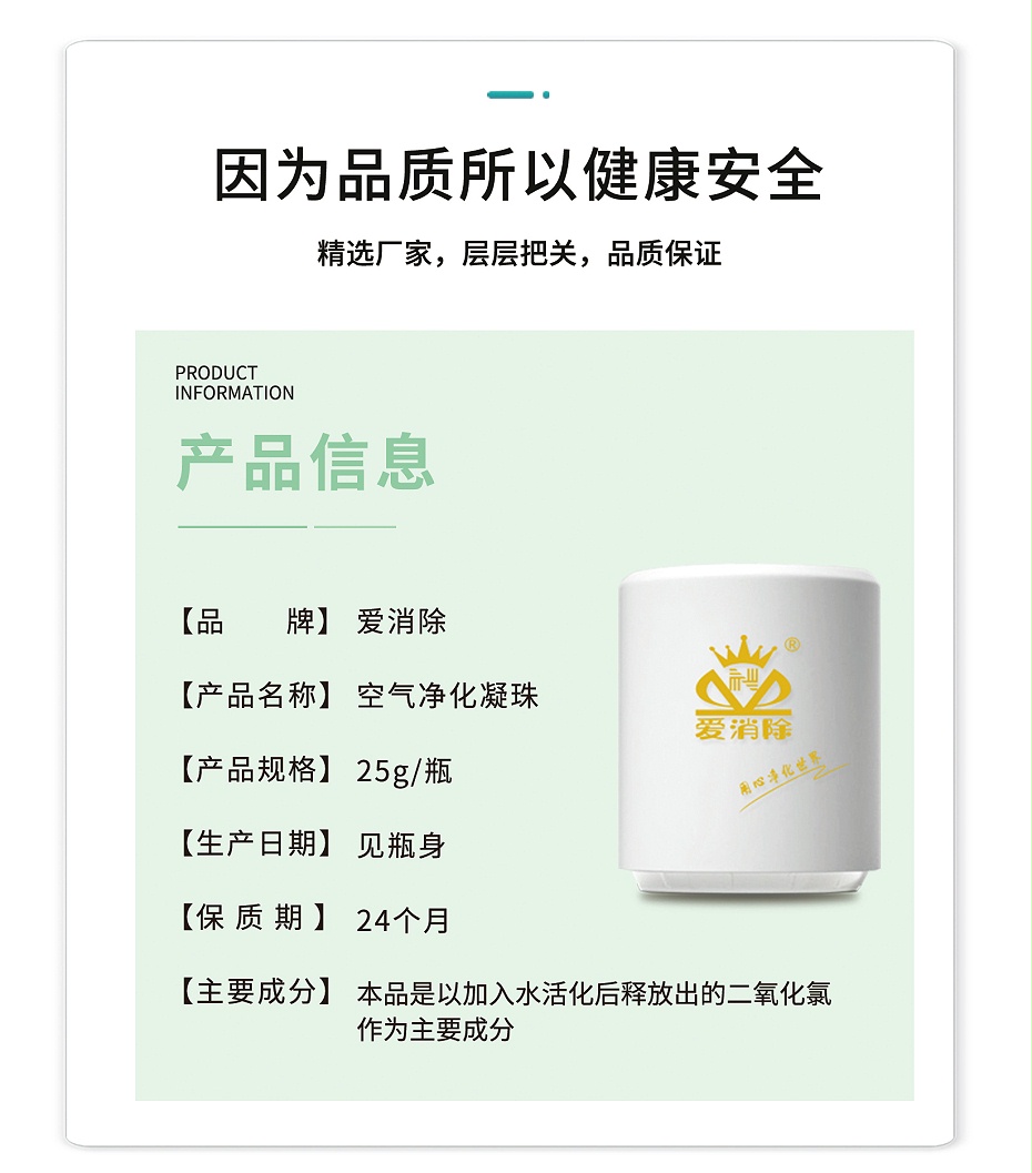 凝膠型二氧化氯消毒粉,采用緩釋控釋載香技術(shù),氣味清新自然,有效釋放可達2-3個月,每天保護您的身體健康。特別適合空間消毒、除臭、保鮮、除甲醛,二氧化氯能散發(fā)到每一個角落進行立體消毒。使用范圍 :客廳、書房、臥室、鞋柜、廚房、衛(wèi)生間、冰箱、汽車、保鮮庫等半封閉空間。可有效去除甲醛、煙味、鞋臭等異味;并能有效地殺菌消毒。